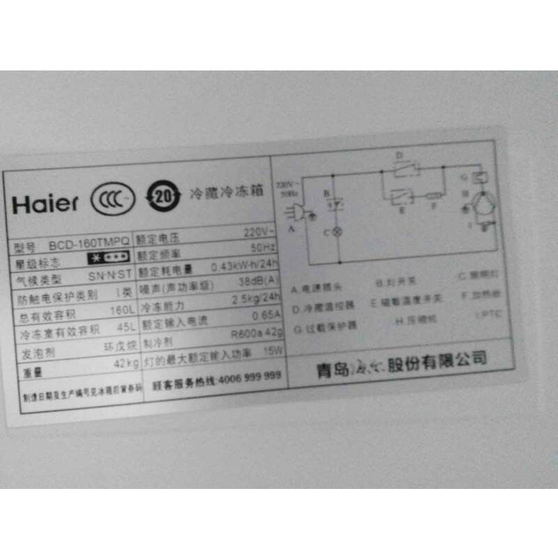 商品名称:Haier/海尔 BCD-160TMPQ 160升家用节能两门电冰箱双门 冷藏冷冻