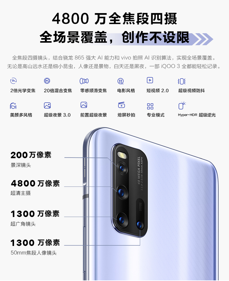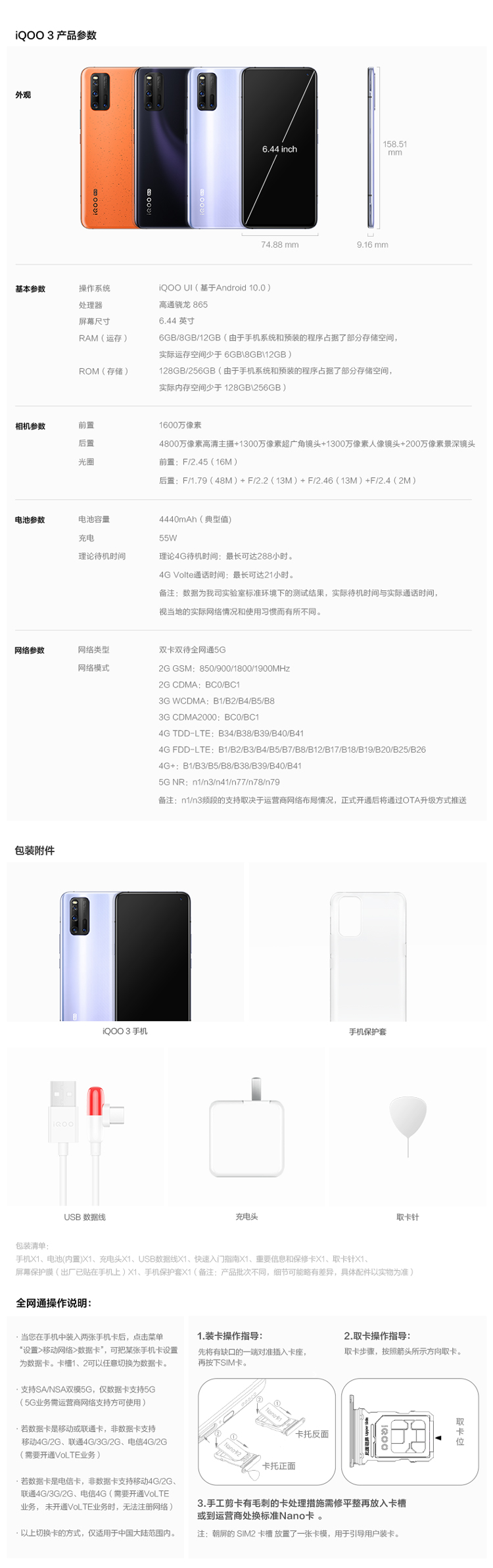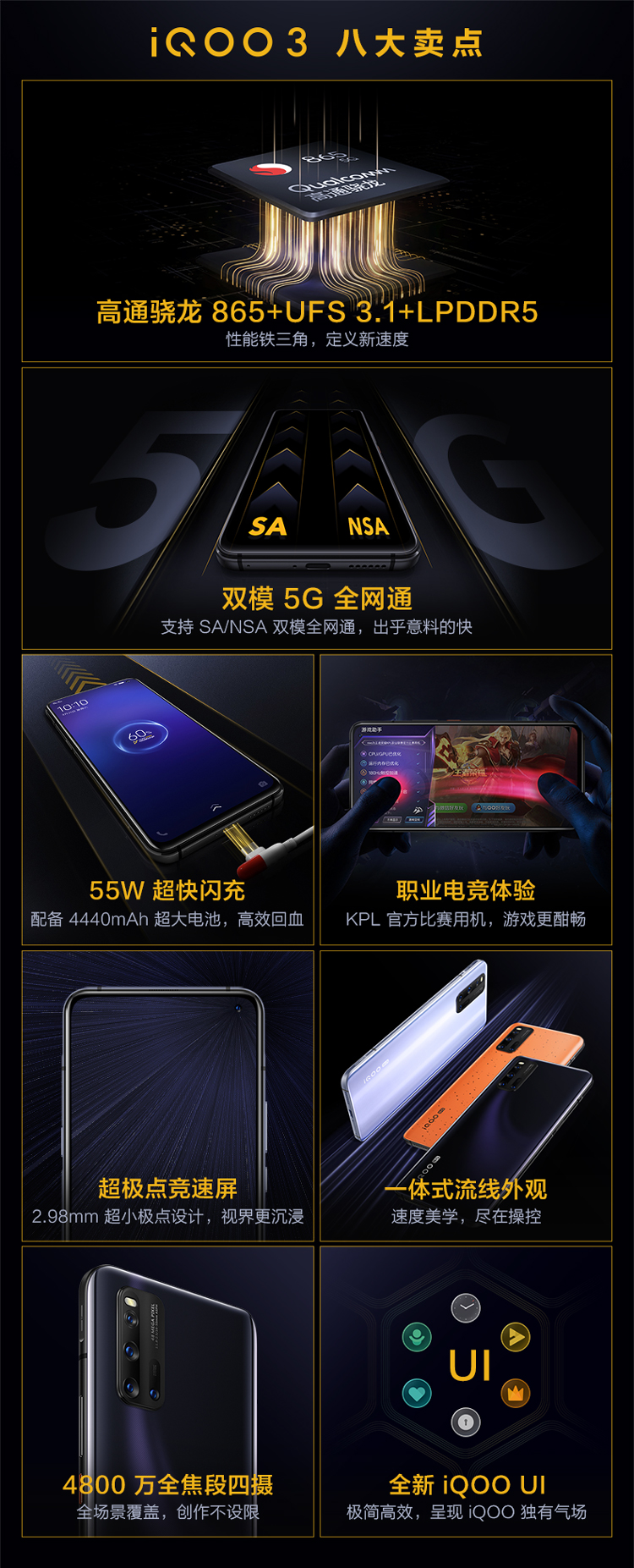 商品名称:iQOO 3 5G 12GB+128GB 驭影黑 高通骁龙865 55W超快闪充 专业电竞游戏体验手机 双模5G全网通手机