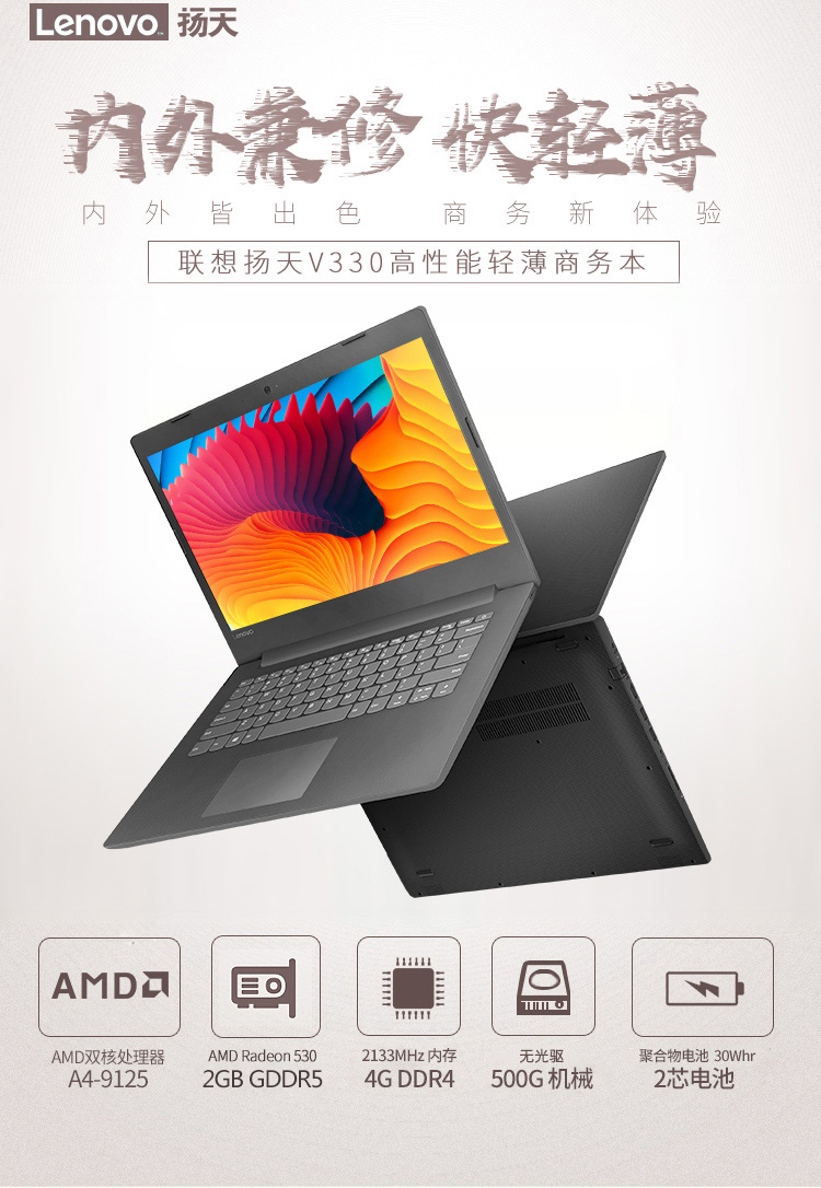商品名称:联想(Lenovo)扬天V330 14英寸轻薄娱乐商务影音家用笔记本电脑(A4-9125 4G 500G 2G独显 win10 防眩光屏 扬天定制两年上门)星空灰