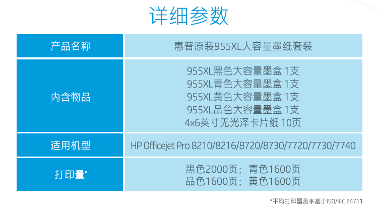 商品名称:惠普 HP 2PD46A 原装955XL 大容量墨纸套装(适用8210 8710 8720 7720 7740)含10张无光泽卡片纸