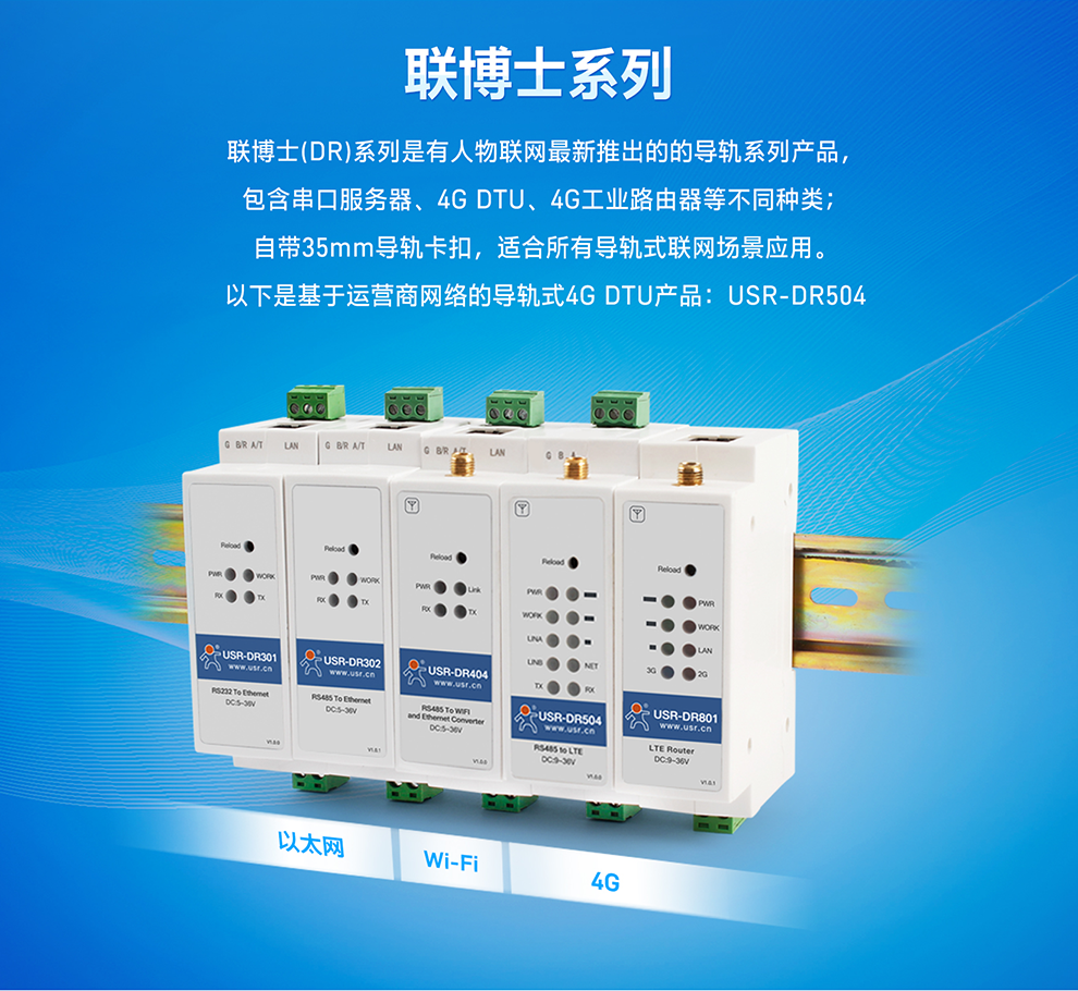 工业级导轨式4g dtu无线数据传输设备全网通有人物联网USR-DR504联博士系列 裸机+天线