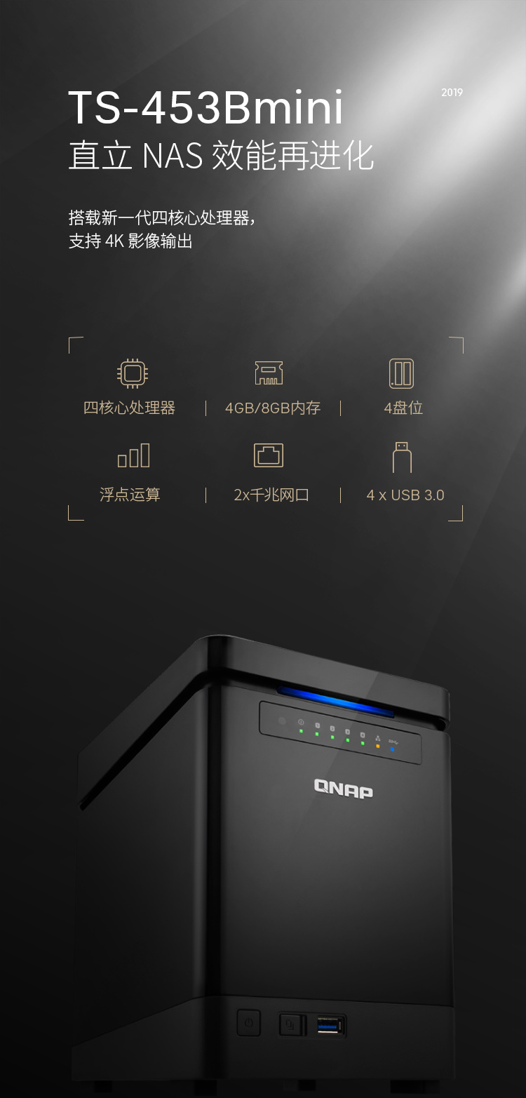 威联通(QNAP)TS-453Bmini 4G内存 四核处理器 直立 NAS 四盘位网络存储(无内置硬盘)