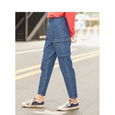 商品名称:茵曼秋装新款棉麻中腰宽松立体贴袋潮流个性小脚哈伦牛仔裤女【1893164883】 浅牛仔