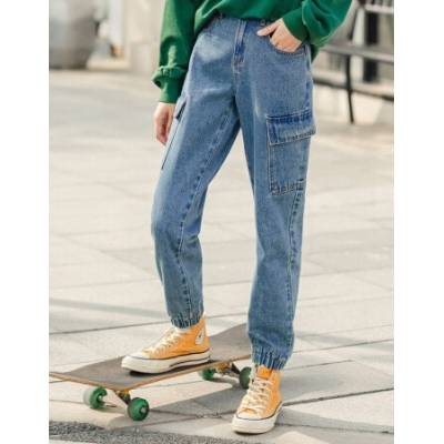 商品名称:茵曼2020春装新款个性工装风多口袋收脚显瘦水洗牛仔裤长裤女【F1801398】 牛仔蓝