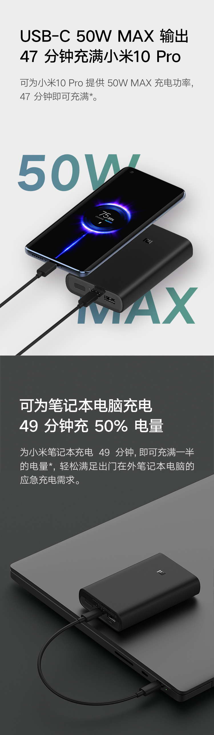 小米移动电源3 10000mAh 超级闪充版 PD快充 可为小米10Pro提供50W MAX极速闪充|两个设备同时充电|高品质锂离子电池