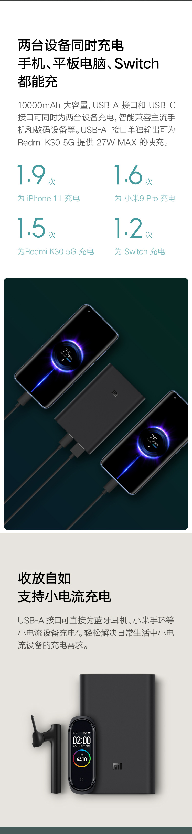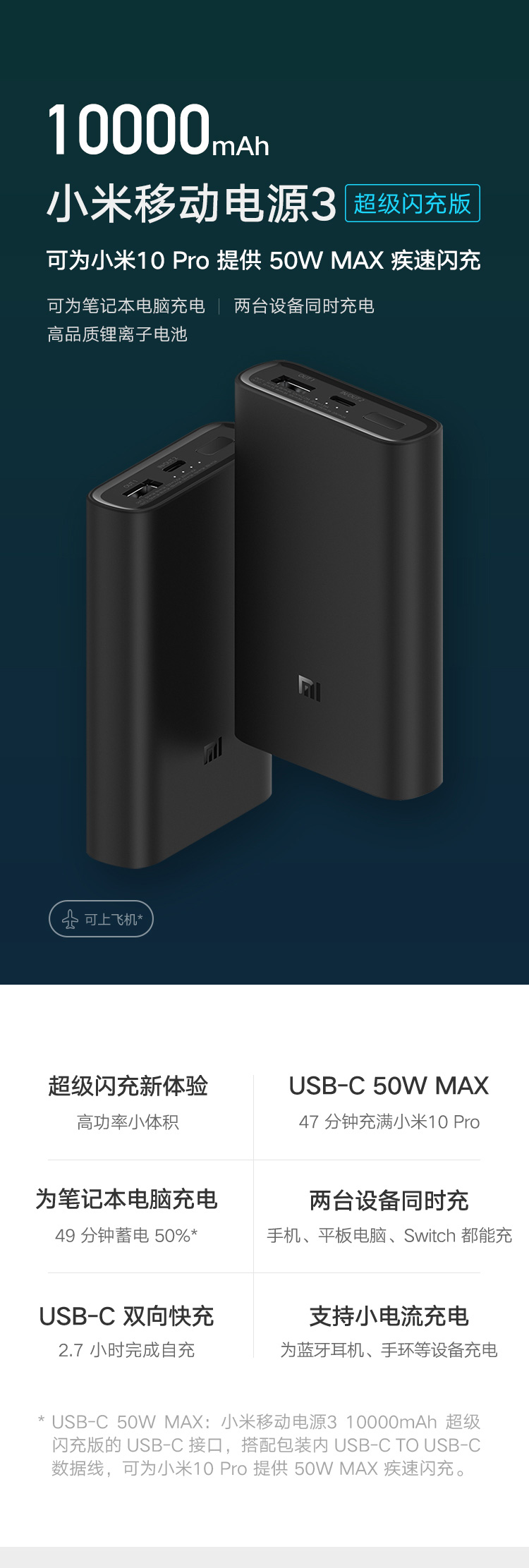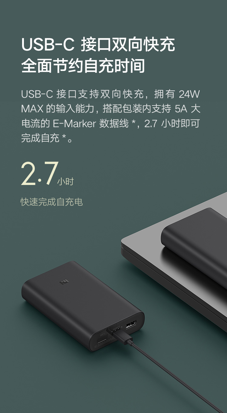 商品名称:小米移动电源3 10000mAh 超级闪充版 PD快充 可为小米10Pro提供50W MAX极速闪充|两个设备同时充电|高品质锂离子电池