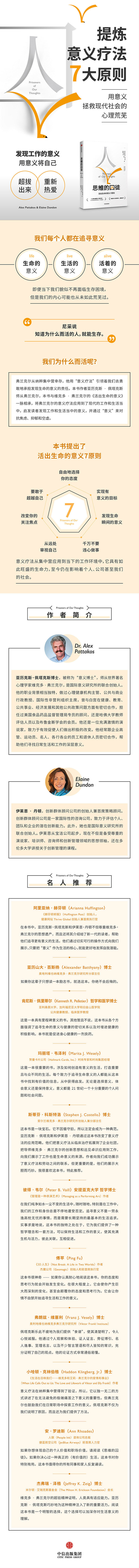 本书作者亚历克斯·佩塔克斯师从世界著名心理学家维克多·弗兰克尔,本书与维克多·弗兰克尔的《活出生命的意义》一脉相承,将弗兰克尔的意义疗法应用到了现代的工作和生活当中,启发读者发现工作和生活当中的意义,并通过“意义”来对抗焦虑、抑郁和空虚。