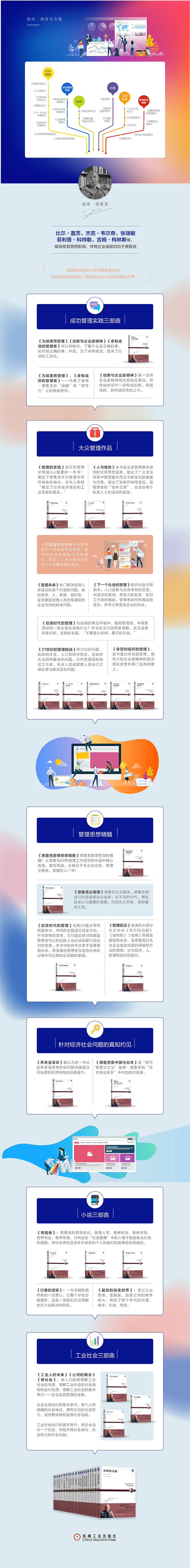 他曾连续20年每月为《华尔街日报》撰写专栏文章,一生在《哈佛商业评论》上共发表38篇文章,至今无人打破这项纪录。他著述颇丰,包括《管理的实践》《卓有成效的管理者》《管理:使命、责任、实践》《旁观者》等几十本著作,被翻译成三十余种文字,总销售量超过1000万册。其中《管理的实践》奠定了他作为管理学科开创者的地位,而《卓有成效的管理者》已成为全球管理者必读经典。