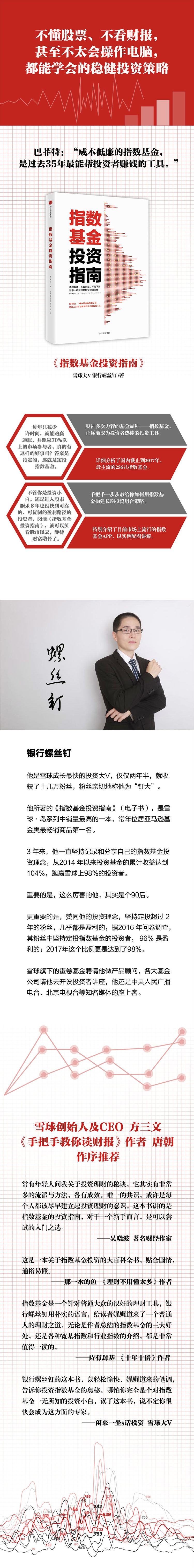 银行螺丝钉的这本书,以轻松愉快、娓娓道来的笔调,告诉你投资指数基金的奥秘。哪怕你完全是个对指数基金一无所知的投资小白,读了这本书,说不定你很快会成为这方面的专家。