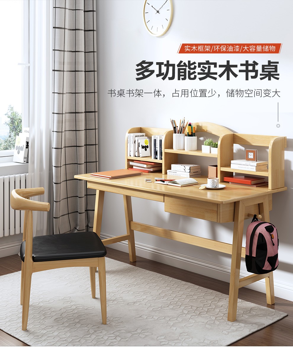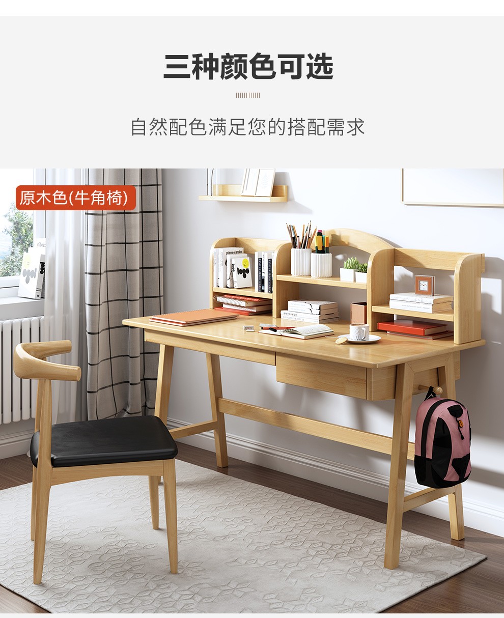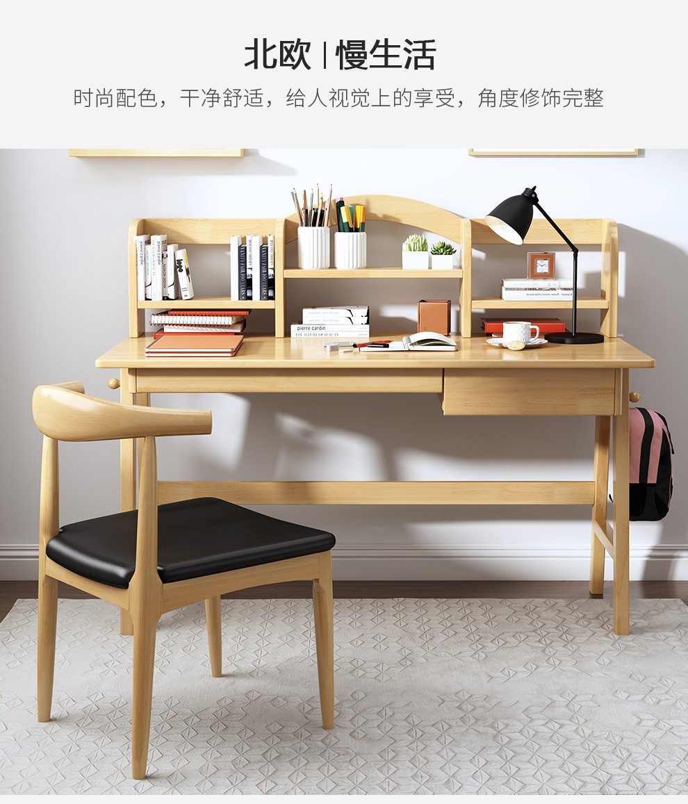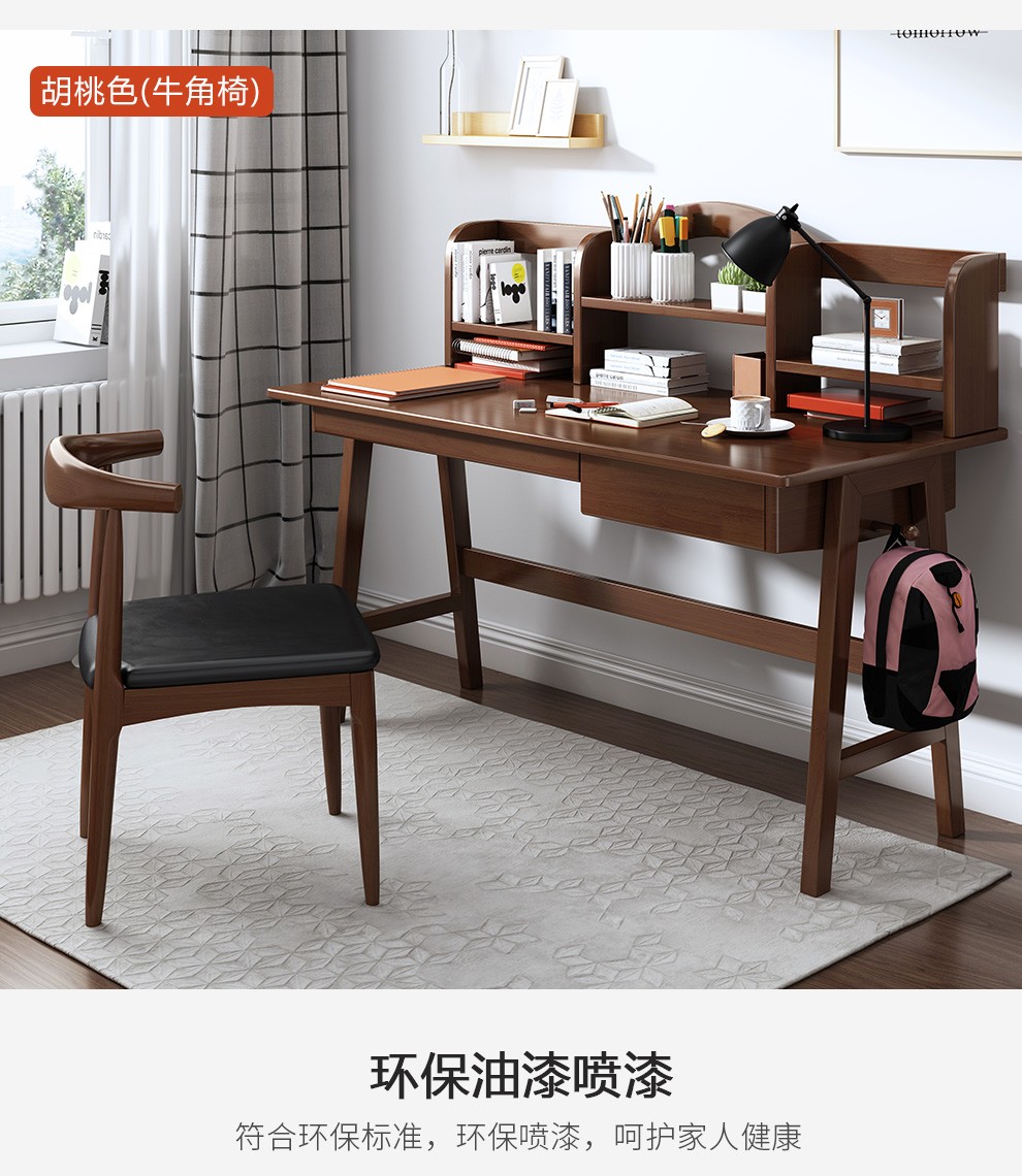 商品名称:风之意 北欧实木书桌 家用小户型办公桌带书架抽屉写字台现代简约笔记本电脑桌SCMY-SZ0013A 胡桃色/牛角椅(书架款) 1.2m桌子+椅子