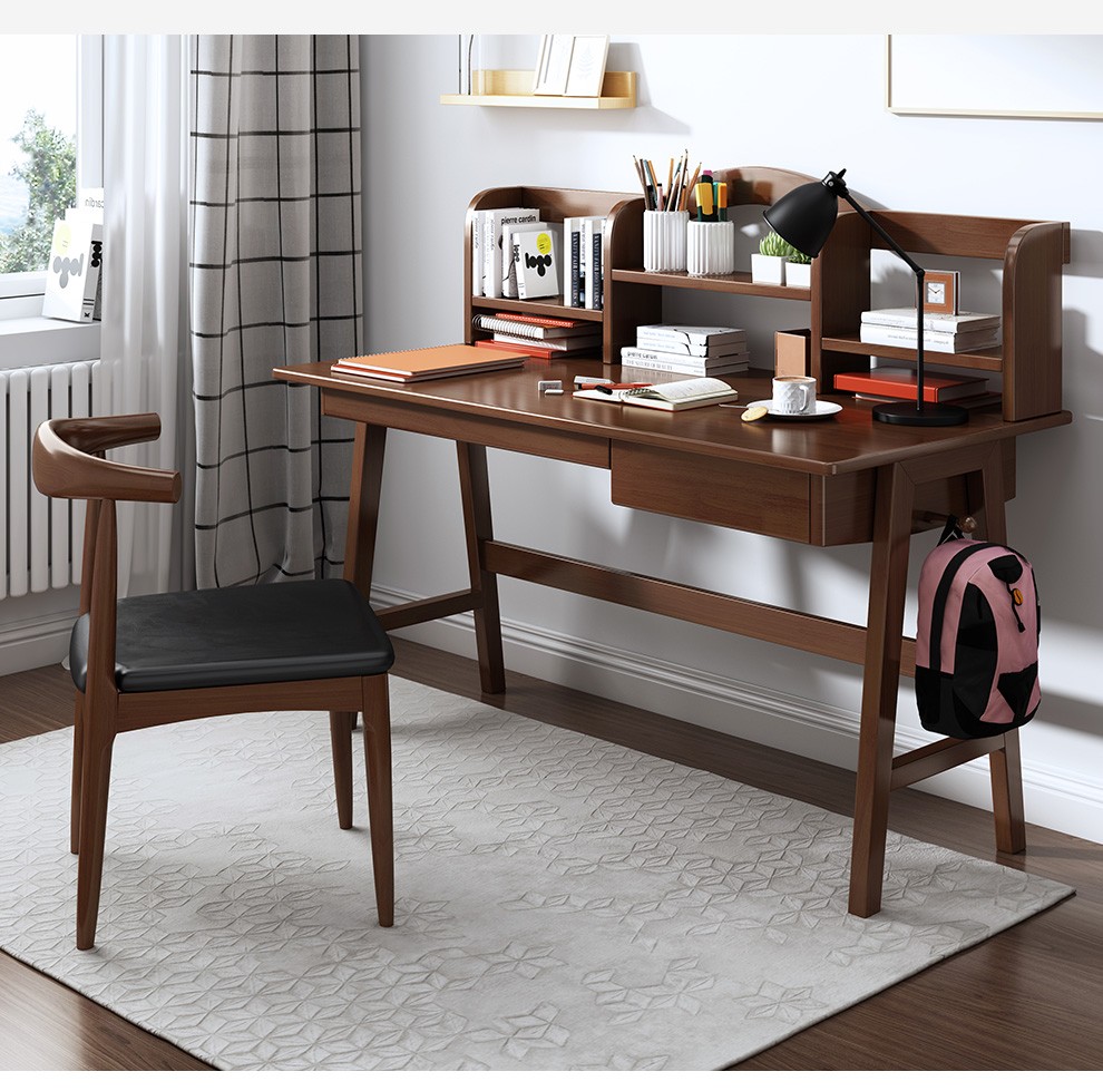 风之意 北欧实木书桌 家用小户型办公桌带书架抽屉写字台现代简约笔记本电脑桌SCMY-SZ0013A 胡桃色/牛角椅(书架款) 1.2m桌子+椅子