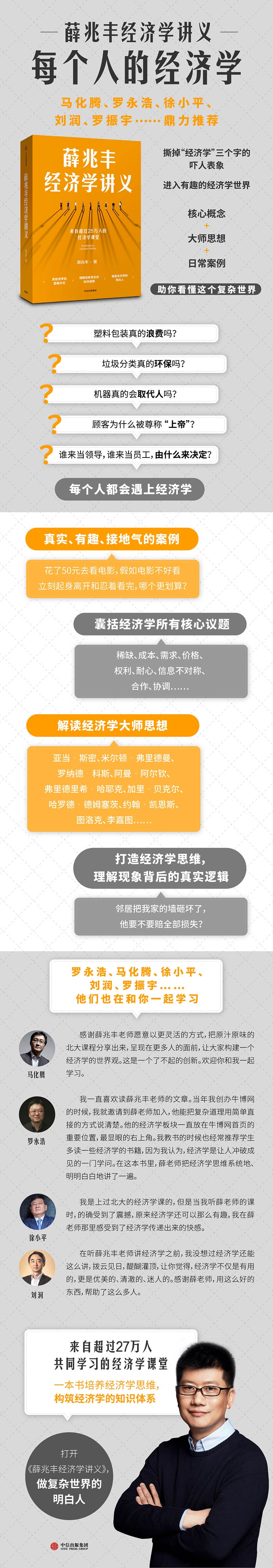 我一直喜欢读薛兆丰老师的文章。当年我创办牛博网的时候,我就邀请到薛老师加入,他能把复杂道理用简单直接的方式说清楚。他的经济学板块一直放在牛博网首页的重要位置,*显眼的右上角。我教书的时候也经常推荐学生多读一些经济学的书籍,因为我认为,经济学是让人冲破成见的一门学问。在这本书里,薛老师把经济学思维系统地、明明白白地讲了一遍。