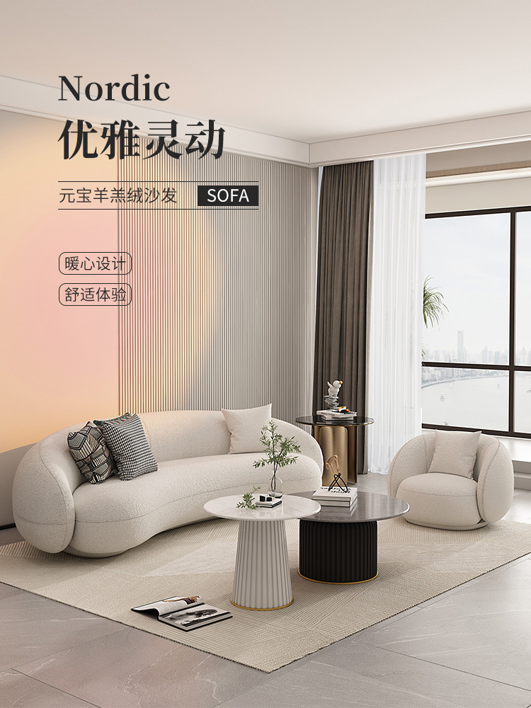 北欧羊羔绒弧形沙发美容院办公休闲接待小户型客厅沙发茶几组合