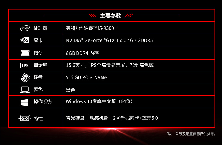 宏碁(Acer)暗影骑士4 15.6英寸 高色域屏 游戏本 笔记本电脑 (I5-9300H标压 8G 512GPCIe GTX1650 4G独显)