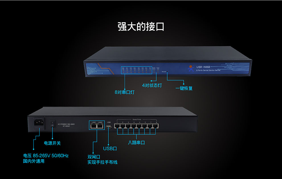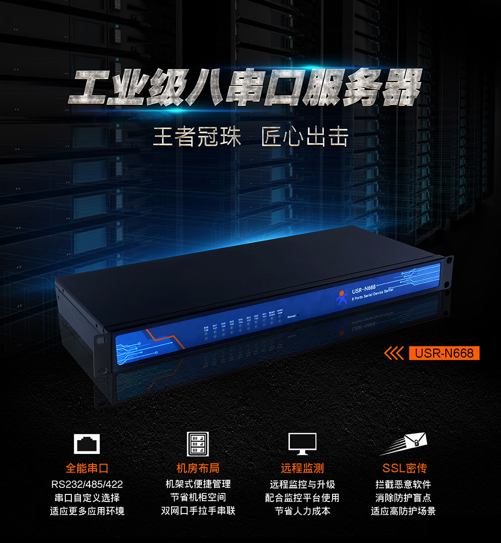 商品名称:8口工业级多串口服务器机架式232/485/422转以太网有人物联网N668