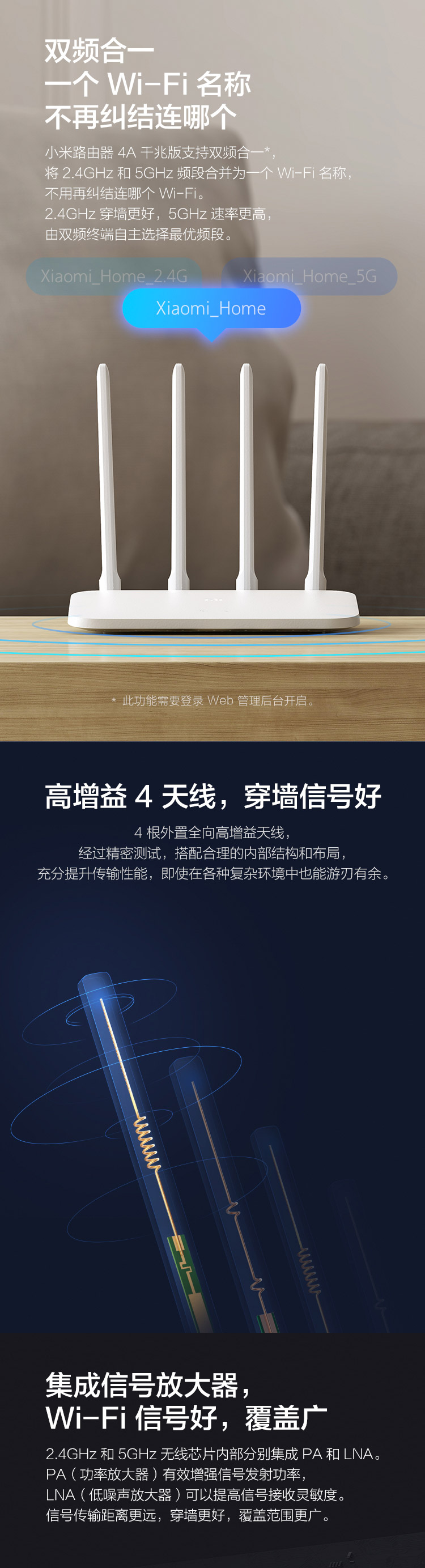 商品名称:小米路由器4A千兆版 双核CPU 双千兆 1200M双频无线速率 5G 家用智能路由器 四天线穿墙 双频合一 光纤适用