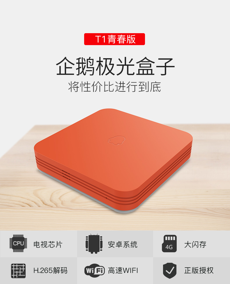 腾讯企鹅极光盒子T1青春版 网络电视机顶盒4核 电视盒子 智能安卓高清播放器wifi+网口