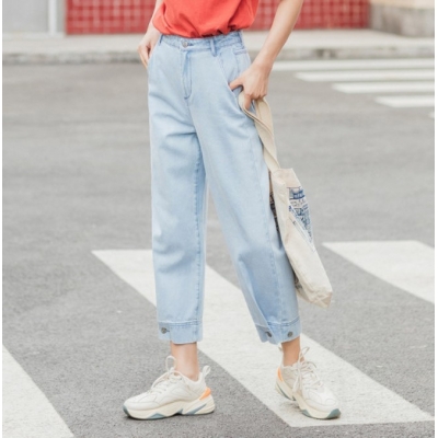 商品名称:茵曼2020夏季新款纯棉浅色水洗牛仔裤九分裤萝卜裤可调节裤脚女【1802263】 浅牛仔