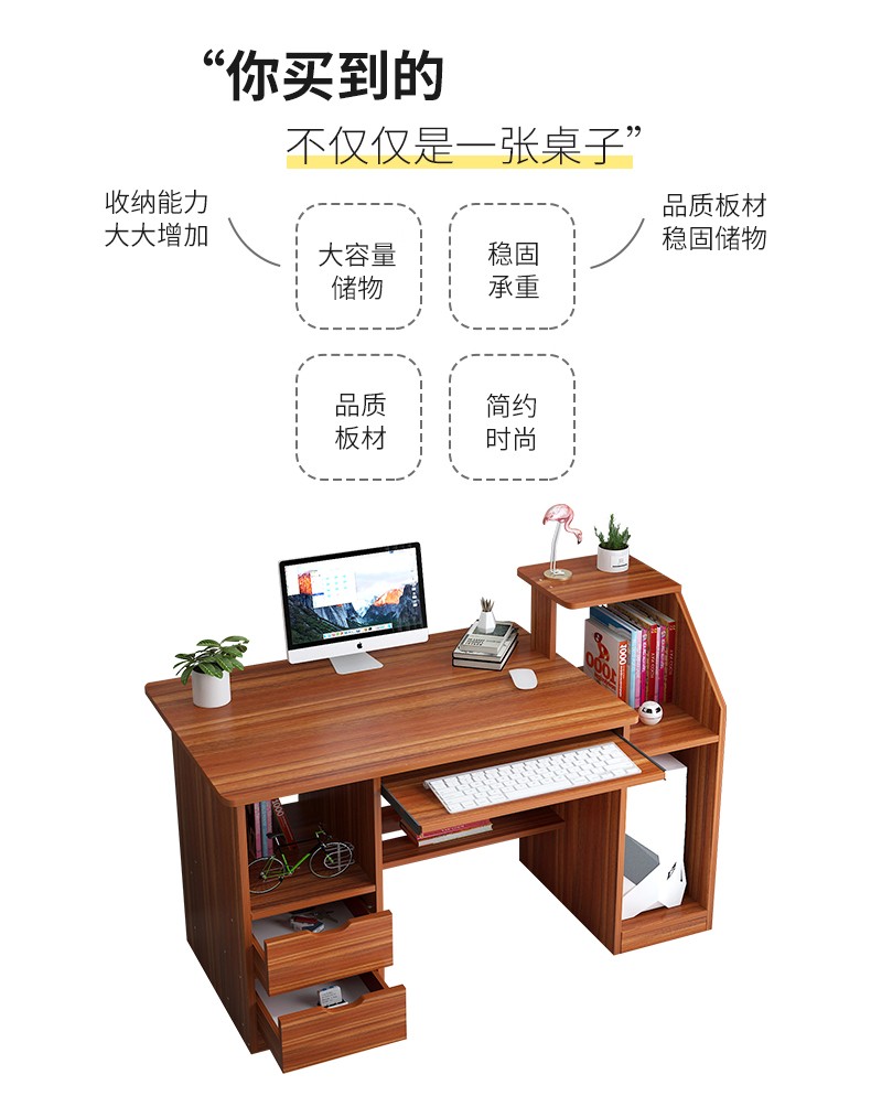 商品名称:亿家达电脑桌台式笔记本家用简易办公桌带书架写字台简约书桌子 古檀木色两抽
