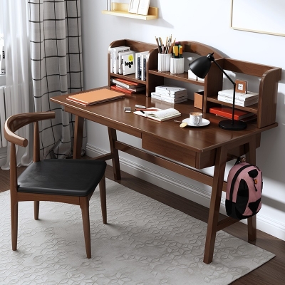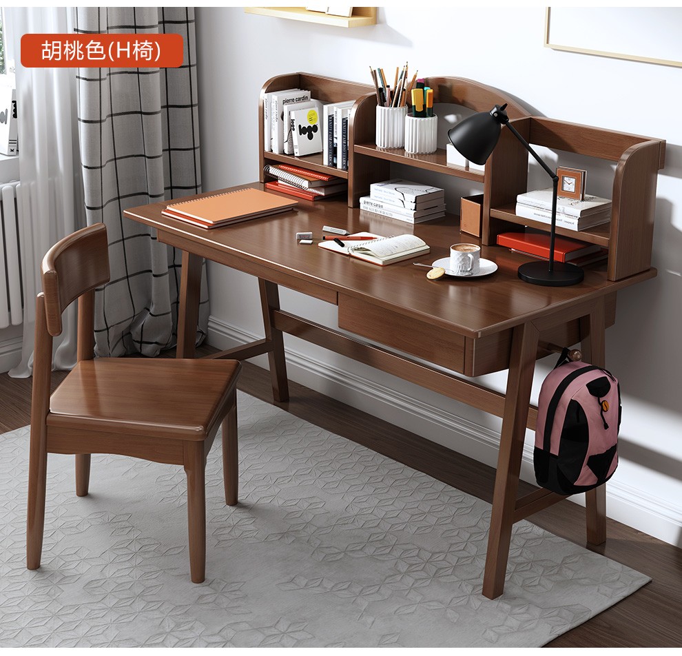 商品名称:风之意 北欧实木书桌 家用小户型办公桌带书架抽屉写字台现代简约笔记本电脑桌SCMY-SZ0013A 胡桃色/牛角椅(书架款) 1.2m桌子+椅子